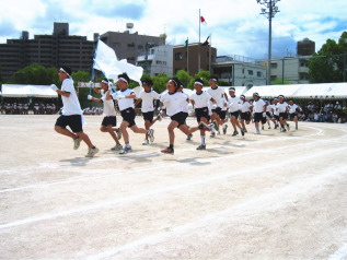お互いに相手の組に声援を送ったあとで、自分たちの組の優勝を願って大きな声で声援を送りました。