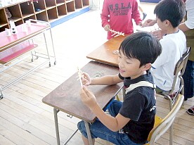割り箸と輪ゴムを使って、割り箸鉄砲を作りました。できあがった鉄砲で的当てゲームをしました。
