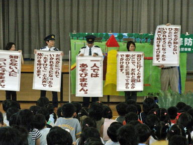| 自己防衛プログラムでは、寸劇を見ながら自分の安全を守ることを勉強しました。 鷹野橋交番、中央警察署、少年補導協助員、千田セーフティパトロール隊、千田母親クラブの方々にもご協力いただきました。 |